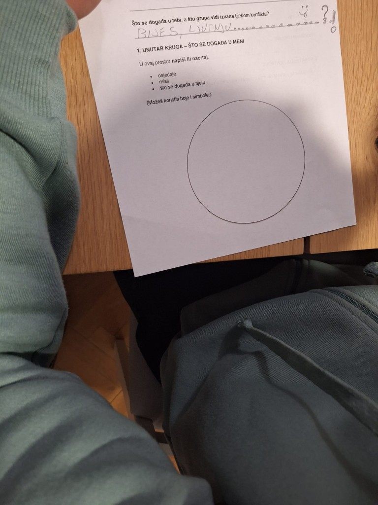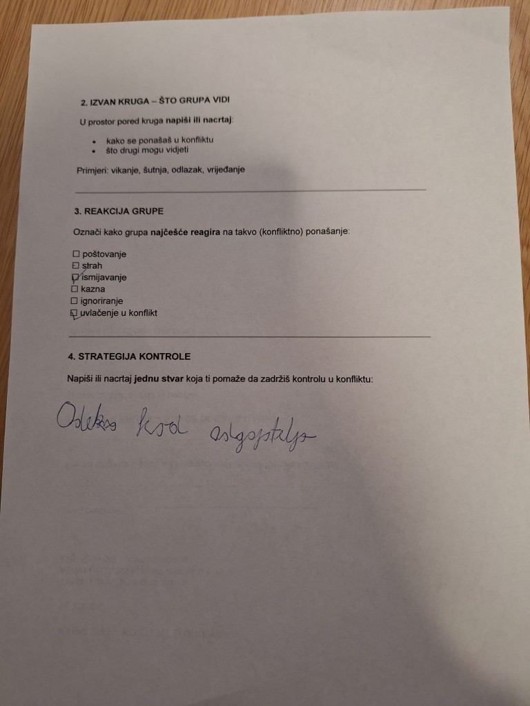 Na drugoj radionici navodili smo strategije smirivanja u konfliktu s naglaskom na utjecaj i reakciju grupe, dok smo na trećoj radili u manjim grupama.